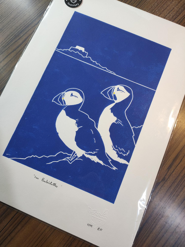 Les Barbélottes (Guernsey French for puffins). The two handsome things are looking across the bay towards Fort Grey.